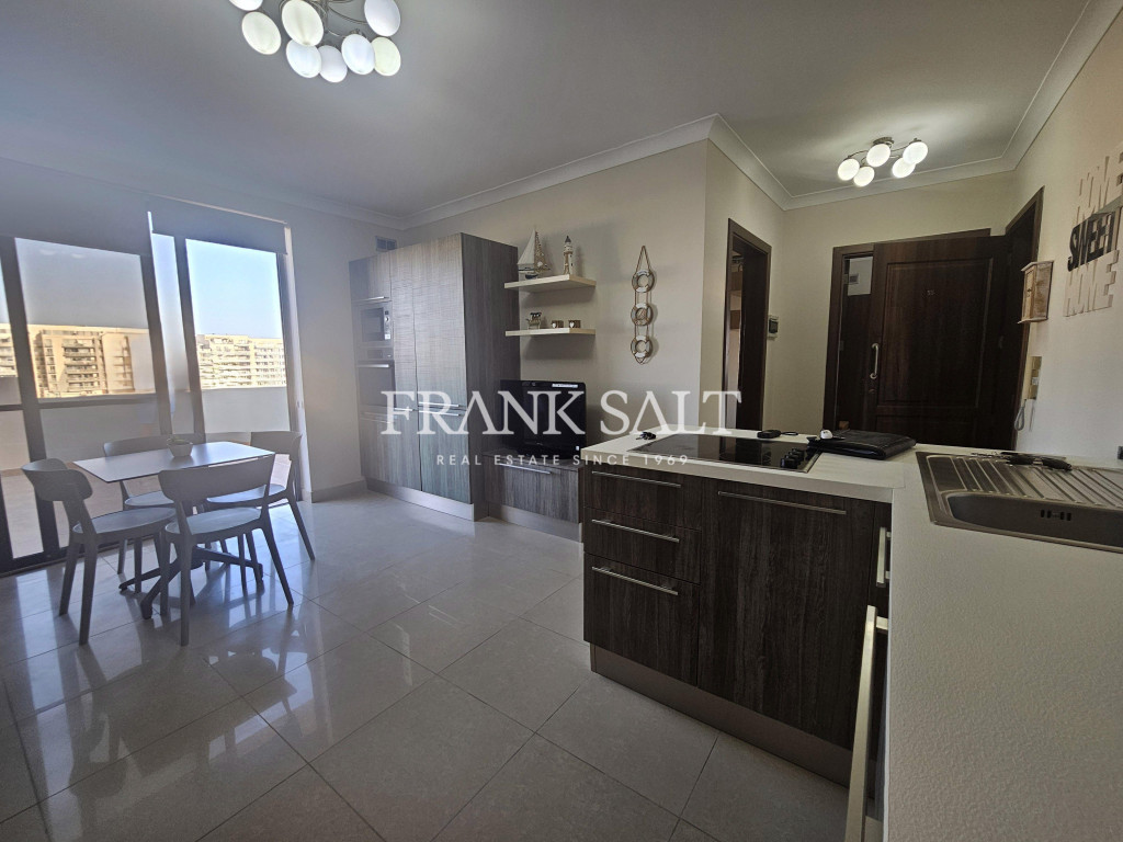 Fully furnished CORNER PENTHOUSE located in a cul-de-sac area close to Qawra promenade and served with a lift. The existing squarish layout comprises a combined kitchen, living and dining area, one bedroom, two bathrooms and an L-shaped corner Terrace facing open space and country views. This property is complemented by approved permits to convert the dwelling into a duplex penthouse. An optional Interconnected garage is also available